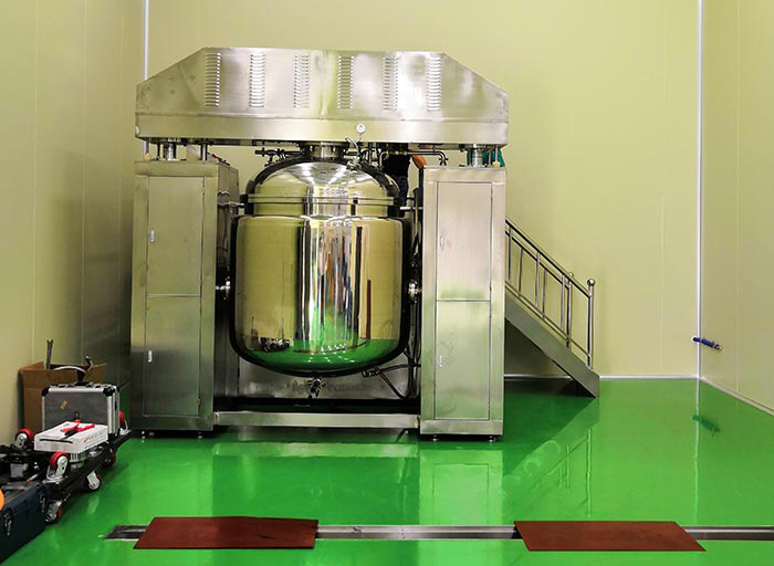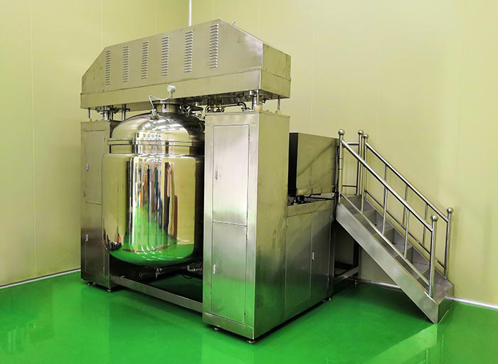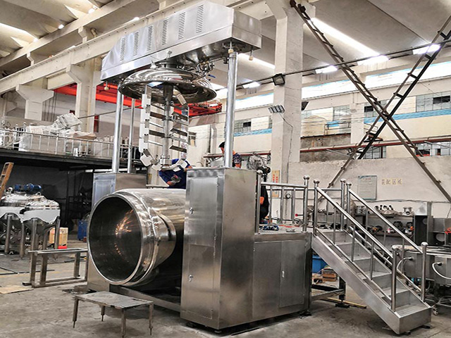 物料在水锅、油锅内通过加热、搅拌进行混合反应后,由真空泵吸入乳化锅,通过乳化锅内上部的中心搅拌、聚四氟乙烯刮板始终迎合搅拌锅形体,扫净挂壁粘料,使被刮取的物料不断产生新界面,再经过叶片的剪断、压缩、折叠,使其搅拌、混合而向下流往锅体下方的均质器处,物料再通过高速旋转的切割轮与固定的切割套之间所产生的强力的剪断、冲击、乱流等过程,物料在剪切缝中被切割,迅速破碎成200um-0.2um的微粒,由于乳化锅内处于真空状态,物料在搅拌过程中产生的气泡被及时抽走。采用抽真空的方式,使所生产的制品在搅拌过程中不再混入气泡,从而保证可制造出富有光泽、细腻及延展性良好的产品。