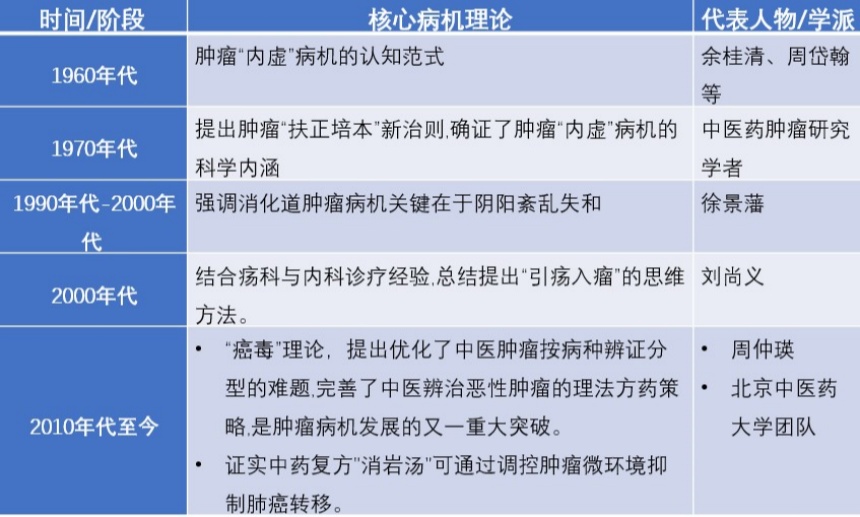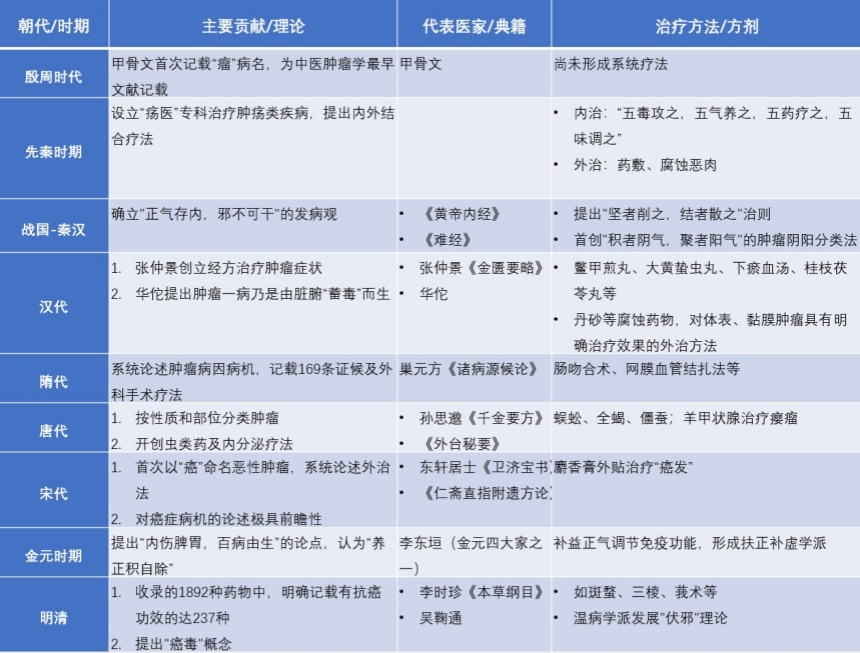 中医作为中国的传统医学,承载着上下五千年的历史文化。在中医发展历程中,关于肿瘤的治疗理念与方法也经历了漫长演变。具体参考下表: