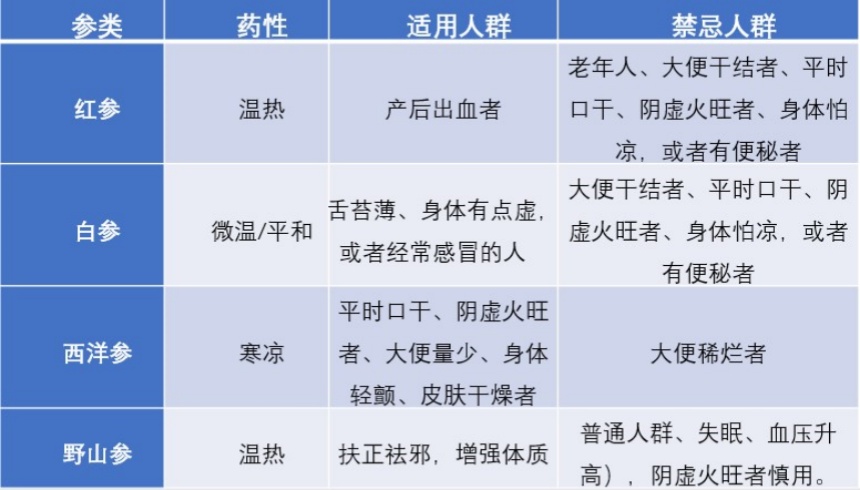 人参分为红参、白参、西洋参、野山参等不同种类。具体参考下表: