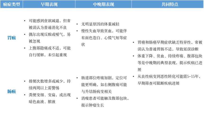 陈红旗副主任医师指出:“胃肠癌患者在疾病早期往往症状隐匿,容易被忽视,而一旦出现明显症状,多已进展至中晚期,因此,早筛早诊早治是关键!”