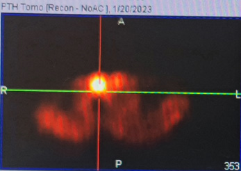 心急如焚的王女士慕名前来上海市第六人民医院甲乳疝外科樊友本主任门诊就诊。基于多年丰富的诊治经验,樊友本主任首先立即让王女士进行甲状旁腺素和血钙检查。初筛验血发现,患者王女士的甲状旁腺素(PTH)高达838.9pg/ml(正常参考值为15-65 pg/ml),血钙3.2mmol/L也高于正常水平(正常值2.08-2.60mmol/L)。结合颈部超声检查发现,患者左侧甲状腺腺体内存在实性肿块,考虑为“甲状旁腺肿瘤”。经核医学科检查发现,甲状旁腺显像+颈胸部SPECT/CT显像提示左叶甲状腺上极占位,诊断“甲状旁腺功能亢进症”。