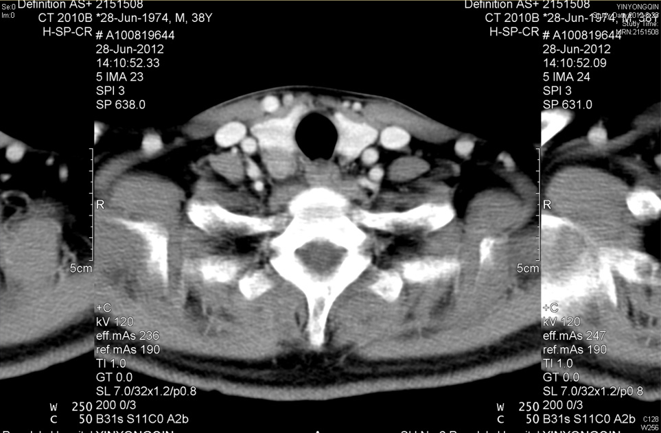 图3 右侧甲状旁腺癌 增强CT