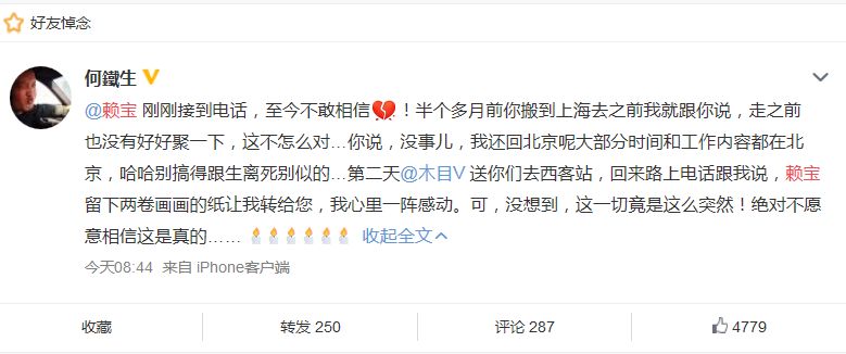 20日早晨,书画家何铁生在社交平台发文悼念:“半个多月前你搬到上海去之前我就跟你说,走之前也没有好好聚一下,这不怎么对…你说,没事儿,我还回北京呢大部分时间和工作内容都在北京,哈哈别搞得跟生离死别似的…第二天@木目V 送你们去西客站,回来路上电话跟我说,赖宝留下两卷画画的纸让我转给您,我心里一阵感动。可,没想到,这一切竟是这么突然!绝对不愿意相信这是真的……”,随后,何铁生在评论区回复网友留言表示,赖宝是19日去世的,原因是心脏病。